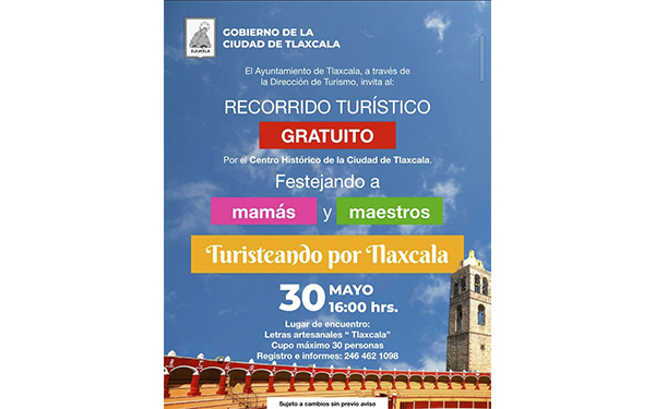 385 Grados / Tlaxcala Capital / REDACCIÓN / El Ayuntamiento de Tlaxcala, a través de la Dirección de Turismo, ha organizado un evento especial este 30 de mayo a las 16:00 horas para celebrar el Día de las Madres y el Día del Maestro. La ciudad ofrecerá un recorrido turístico gratuito por el Centro Histórico, brindando una oportunidad única para que residentes y visitantes descubran los encantos y la rica historia de Tlaxcala.