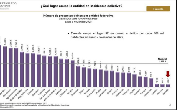 El estado de Tlaxcala cerró noviembre de 2025 con solo 165 delitos registrados, consolidándose como el mes con menor actividad delictiva para este periodo desde hace siete años. Según datos del SESNSP, esta cifra representa una reducción del 18.72% en comparación con octubre.