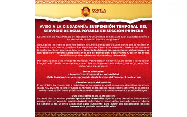 385 Grados / Contla de Juan Cuamatzi / REDACCION / El Ayuntamiento de Contla de Juan Cuamatzi, a través de la Dirección de Agua Potable, informó sobre la suspensión temporal del servicio de agua potable en la Sección Primera del municipio, derivado de los trabajos de rehabilitación urbana que se realizan en la Avenida Juan Cuamatzi.