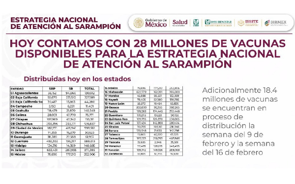 Por otra parte, se dio a conocer que, al momento, se cuenta con 28 millones de vacunas disponibles para la Estrategia Nacional de Atención al Sarampión, y adicionalmente 18.4 millones de vacunas se encuentran en proceso de distribución para la semana del 9 de febrero y la semana del 16 de febrero. En el caso de Tlaxcala, se distribuyeron 35 mil 581 dosis en total.