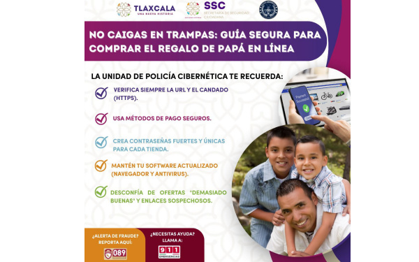 385 Grados / SSC / REDACCIÓN / Con motivo del Día del Padre y el aumento de compras en línea durante esta temporada, la Secretaría de Seguridad Ciudadana (SSC) a través de la Unidad de Policía Cibernética, da a conocer una serie de recomendaciones para prevenir fraudes y proteger a las familias tlaxcaltecas durante sus transacciones en línea.