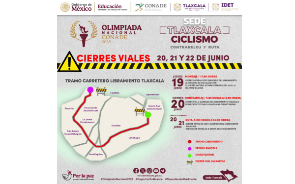 385 Grados / IDET / REDACCIÓN / El Instituto del Deporte de Tlaxcala (IDET) anunció el cierre del Libramiento Tlaxcala, en el tramo que contempla la zona de El Trébol hasta la entrada del municipio de Chiautempan, a partir del próximo jueves 19 de junio hasta el domingo 22, como medida para garantizar la seguridad de atletas y delegaciones que participarán en la disciplina de Ciclismo en su modalidad contrarreloj y ruta, en las ramas femenil y varonil.
