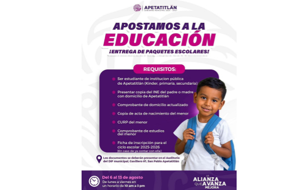 385Grados / Apetatitlán / REDACCIÓN / El presidente municipal Azain Ávalos Marban anunció la apertura de la convocatoria para la primera entrega de paquetes de útiles escolares, dirigida a estudiantes inscritos en escuelas públicas de nivel preescolar, primaria y secundaria del municipio. Esta medida busca promover la igualdad de condiciones educativas y respaldar directamente a las familias en el arranque del ciclo escolar 2025–2026.
