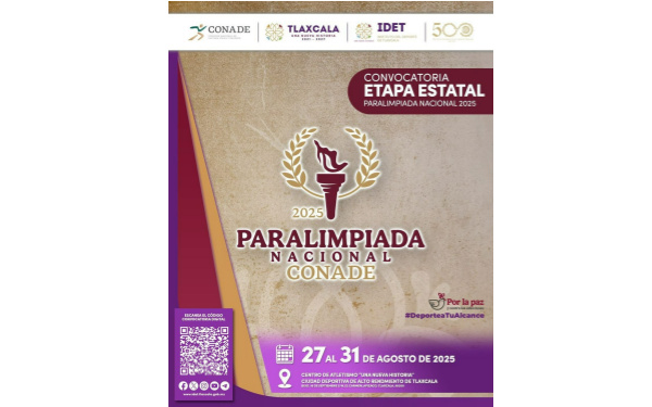 385 Grados / IDET / REDACCIÓN / El Instituto del Deporte de Tlaxcala (IDET) convoca a deportistas con discapacidad motora, visual, auditiva, intelectual, síndrome de Down y personas de talla baja a participar en la etapa estatal selectiva de la Paralimpiada Nacional Conade 2025, que se llevará a cabo en la Ciudad Deportiva de Alto Rendimiento, en Apizaco, del 27 al 31 de agosto.