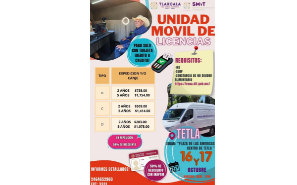 La dependencia informó que la próxima semana, en el municipio de Tetla de la Solidaridad, se instalará la unidad los días 16 y 17 de octubre, donde las y los conductores podrán realizar trámites de expedición y renovación de licencias en sus distintas modalidades.