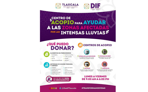 Las donaciones pueden entregarse de lunes a viernes, de 9:00 a 18:00 horas, en los siguientes puntos: Clínica de las Emociones (Av. Politécnico No. 14, Col. La Loma Xicohténcatl, Tlaxcala), Oficinas del Sedif (Calle Morelos No.5, Col. Centro, Tlaxcala), Cecapdif (Carretera Ocotlán–Chiautempan, frente al Cobat 01, Tlaxcala) y Casa de Día (Guerrero 13-30, San Pablo Apetatitlán).