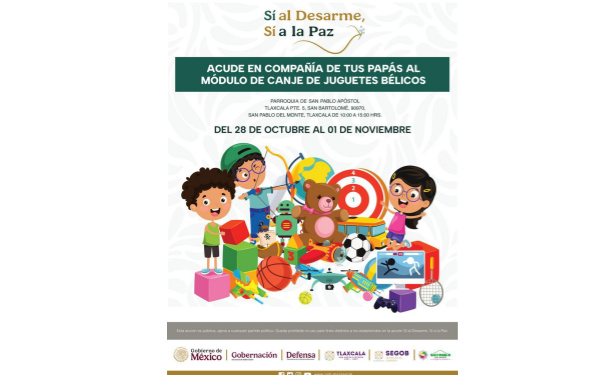 385 Grados / Segob / REDACCIÓN / El Gobierno del Estado de Tlaxcala, en coordinación con la Secretaría de Gobernación (Segob), la Secretaría de la Defensa Nacional (Defensa) y el ayuntamiento de San Pablo del Monte, invita a la población a sumarse a la campaña nacional “Sí al Desarme, Sí a la Paz”, que continuará hasta el próximo sábado 1 de noviembre en la Parroquia de San Pablo Apóstol.