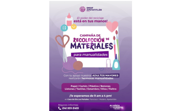 385Grados / Apetatitlán / REDACCIÓN / El Sistema Municipal para el Desarrollo Integral de la Familia (SMDIF) de Apetatitlán 2024–2027 invita a la población a sumarse a la campaña de recolección de materiales para manualidades, una iniciativa que fomenta el reciclaje, la creatividad y el apoyo a las personas adultas mayores del municipio.