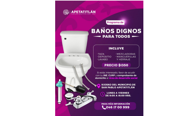 El programa ofrece un paquete completo a un precio accesible de $1,350 pesos, que incluye taza, depósito, lavabo, mezcladoras, manguerillas y herraje, permitiendo a las familias contar con un baño funcional, limpio y digno.