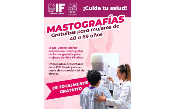 385 Grados / Emiliano Zapata / REDACCION / Con el objetivo de fomentar la detección oportuna del cáncer de mama, el DIF Municipal de Emiliano Zapata, en coordinación con el DIF Estatal, ofrece mastografías gratuitas para mujeres de 40 a 69 años.