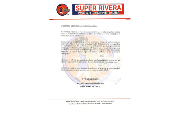 385 Grados / Tlaxcala / REDACCION / Una mujer identificada como Matilde Yadira N., colaboradora de la cadena comercial Súper Rivera, falleció este lunes al interior de una de las sucursales de la empresa, según confirmó la propia compañía a través de un comunicado dirigido a empleados, clientes y público en general.