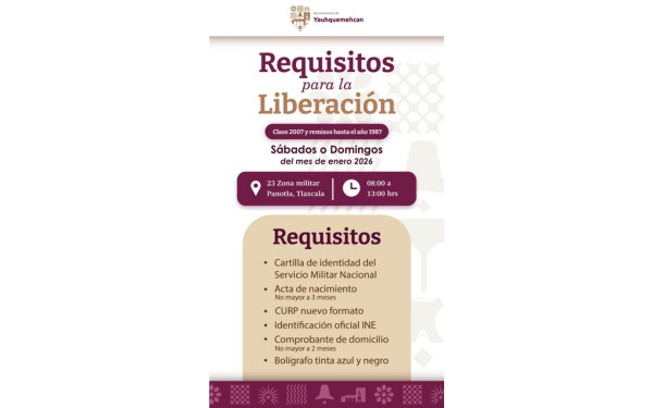 385 Grados / Yauhquemehcan / REDACCIÓN / El Ayuntamiento de Yauhquemehcan dio a conocer los requisitos y fechas para la liberación de la Cartilla del Servicio Militar Nacional dirigida a la Clase 2006 y a remisos hasta el año 1987. El trámite se realizará durante los sábados y domingos del mes de enero de 2026 en las instalaciones de la 23ª Zona Militar, ubicadas en Panotla, Tlaxcala, en un horario de 08:00 a 13:00 horas.