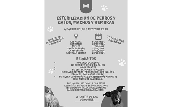 385 Grados / Xaltocan / REDACCIÓN / La comunidad local se prepara para la campaña de esterilización gratuita de perros y gatos, tanto machos como hembras, que se llevará a cabo en varias fechas durante el mes de mayo de 2024. Este esfuerzo busca controlar la población de mascotas y mejorar su salud y bienestar.