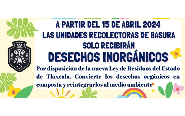 385 grados / Tlaxcala / redacción/ el ayuntamiento de Yauhquemehcan informa a la ciudadanía que, a partir del 15 de abril de 2024, los carros recolectores de basura solo recibirán los desechos inorgánicos con base a la nueva ley de residuos del estado de Tlaxcala.