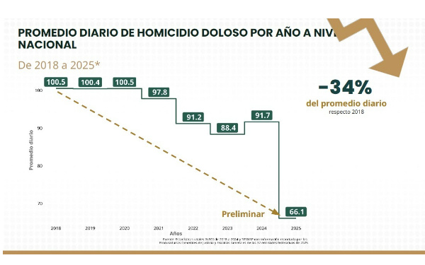 El reporte del SESNSP resalta la disminución de 37 por ciento en el promedio diario de homicidios dolosos, de septiembre de 2024 a octubre de 2025, al pasar de un promedio de 86.9 víctimas diarias a 54.5, respectivamente, lo que indica que hubo 32 homicidios dolosos menos diarios. Además, el promedio diario de homicidios dolosos por año, a nivel nacional, también presentó una reducción del 34 por ciento entre 2018 y los 10 meses de 2025, al pasar de 100.5 a 66.1.