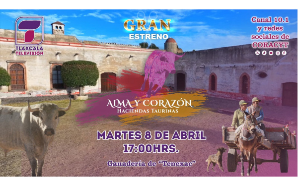 385 Grados / Coracyt / REDACCIÓN / a Coordinación de Radio, Cine y Televisión (Coracyt), presentó oficialmente su nuevo programa de televisión “Alma y Corazón, Haciendas Taurinas”, una producción que destaca la cultura, tradición y legado histórico de las haciendas tlaxcaltecas vinculadas a la tauromaquia. El estreno será el 8 de abril a las 17:00 horas, con su repetición el domingo 13, 16:30 horas; a través de Tlaxcala Televisión (canal 10.1).