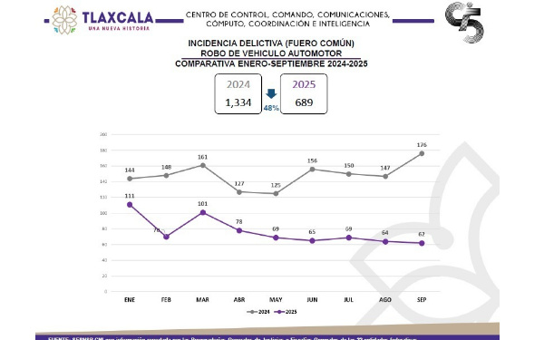El mismo reporte indica que, en lo que va de 2025, el robo de vehículo automotor en el estado muestra una tendencia descendente, y por debajo de los niveles observados el año pasado. Mientras en septiembre de 2024 se registraron 176 casos, en septiembre de este año la cifra fue de 62.