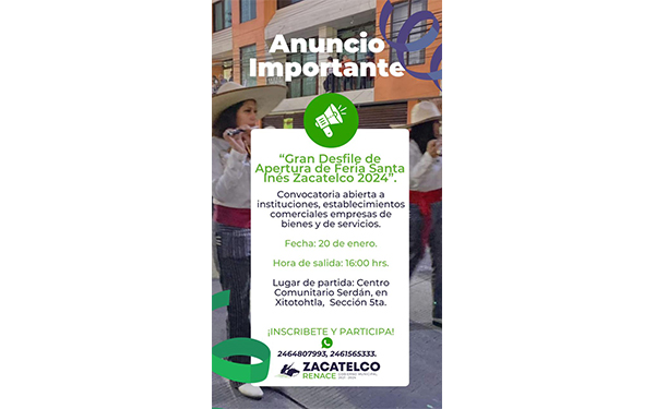 “Gran Desfile de Apertura de Feria Santa Inés Zacatelco 2024”.