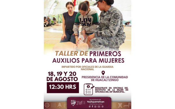385 Grados / Yauhquemehcan / REDACCIÓN / Organizado por el Ayuntamiento de Yauhquemehcan a través del Instituto Municipal de la Mujer. Este curso será impartido por oficiales de la Guardia Nacional, con el objetivo de brindar herramientas de cuidado y prevención. Para más información, acude a las oficinas del Instituto Municipal de la Mujer.