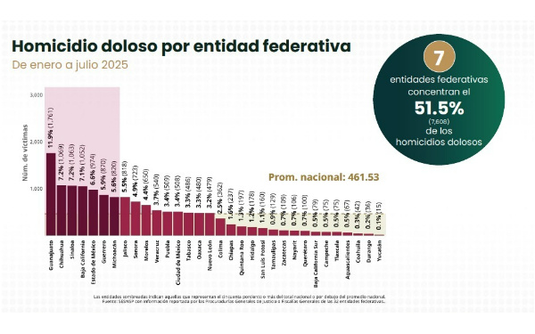 Asimismo, se indicó que siete entidades concentraron el 51.5% de los homicidios dolosos en México: Guanajuato -mil 761-, Chihuahua -mil 069-, Sinaloa -mil 063-, Baja California -mil 052-, Estado de México -974-, Guerrero -870- y Michoacán -820-.
