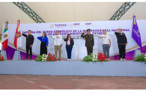 385 Grados / Tlaxcala / REDACCIÓN / La gobernadora Lorena Cuéllar Cisneros, acompañada de autoridades de los tres poderes de gobierno, entregó el fuego simbólico de Independencia Nacional a los 60 ayuntamientos del estado, el cual representa la memoria de los actos heroicos durante la lucha para consolidar a México como una nación independiente.