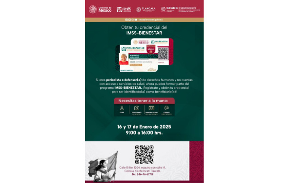 385 Grados. / Segob. / REDACCIÓN / La Secretaría de Gobierno del estado (Segob), a través de la oficina para la protección de personas defensoras de derechos humanos y periodistas, en coordinación con el IMSS-Bienestar, pondrá en marcha la Jornada de Credencialización dirigida a comunicadores y defensores que no cuenten con seguridad social.