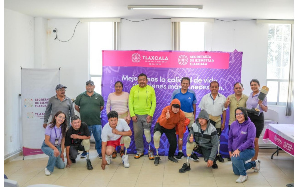 385 Grados / Bienestar / REDACCIÓN / Como parte del trabajo que impulsa la Secretaría de Bienestar estatal para mejorar la calidad de vida de personas con discapacidad y promover su inclusión social, se realizó la primera entrega del año de prótesis transfemoral y transtibial, en beneficio de 12 tlaxcaltecas.