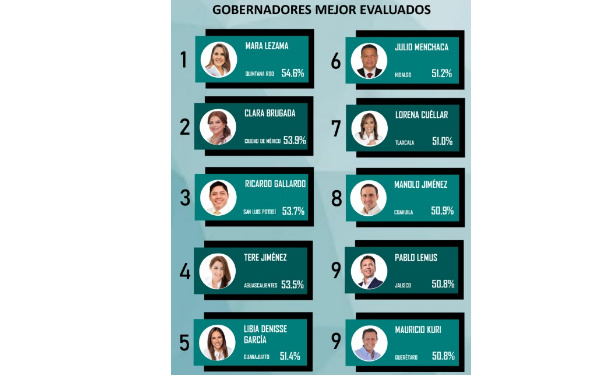 En junio, la medición a cargo de Consulta Mitofsky para El Economista muestra que los mandatarios que mejor califica la ciudadanía son: Mara Lezama, de Quintana Roo (54.6%), Clara Brugada, de la Ciudad de México (53.9%); Ricardo Gallardo, de San Luis Potosí (53.7%); Tere Jiménez, de Aguascalientes (53.5%); Libia Dennise García, de Guanajuato (51.4%); Julio Menchaca, de Hidalgo (51.2%) y Lorena Cuéllar, de Tlaxcala.