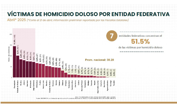 A partir de las cifras preliminares del mes de abril, y con información de las 32 fiscalías estatales en México, el gobierno federal identificó que siete entidades federativas concentraron el 51.5% de las víctimas por homicidio doloso en el país.
